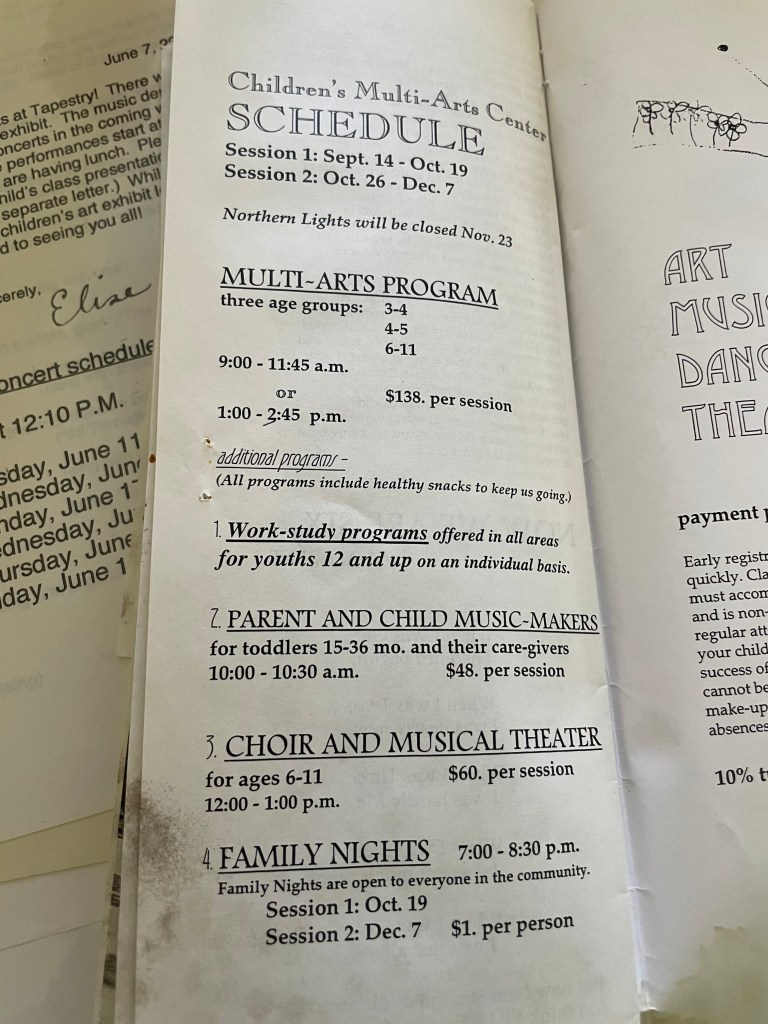 Elise founded and directed Northern Lights Children’s Multi-Arts Center (1993-98)
